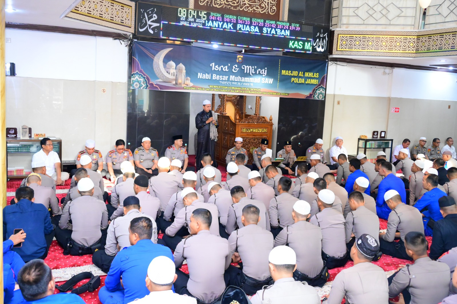 Jambi – Polda Jambi menggelar peringatan Isra’ Mi’raj Nabi Besar Muhammad SAW Tahun 1447 Hijriah / 2026 M di Masjid Al-Ikhlas Polda Jambi, Kamis (22/1/2025)
